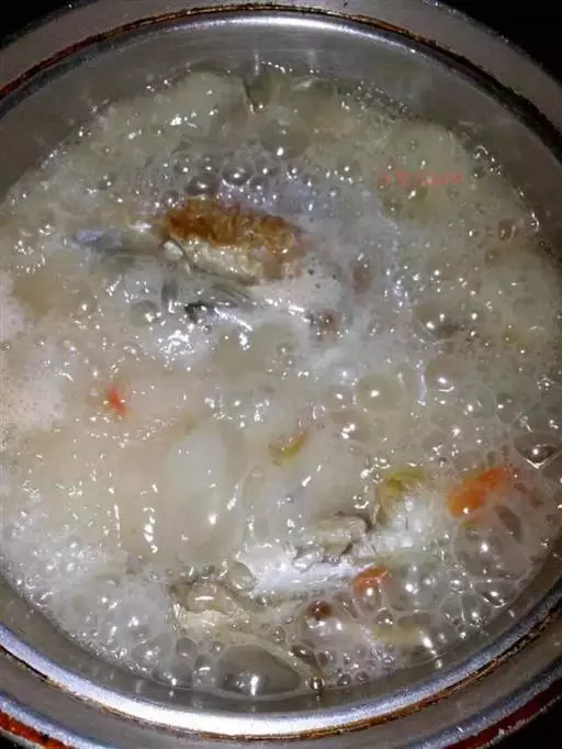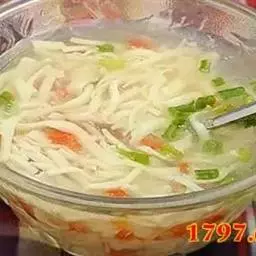 鲫鱼入热猪油锅中煎至两面都呈金黄色,烹入料酒,将鸡汤750毫升、冻豆腐丁一起放入,再加盐、用中火煮至汤呈乳白色时放入熟鸡片、火腿片、菜心、笋片略烧,加味精,用湿淀粉勾芡,淋几滴猪油即成。