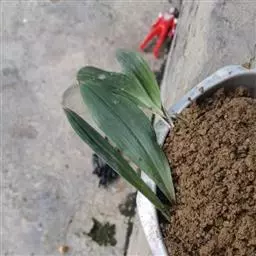 方法一 准备好兰盆及植料后,将兰株倒拿(根在上,叶在下)放于水龙头下以慢水冲洗,但水压切忌过强,以免伤兰根及叶子。用拇指和食指抓住兰头,小指抵住盆缘,用竹筷将根固定,当放入盆内时,尽量不要让根接触到盆壁。将豆粒大的混合石砾倒入盆底至三分之一处。然后倒入中粒植料至五分之四处,填实和尽量不要留下空间。将竹筷拔出,并摇实盆中植料。填实植料后,再用大粒植料埴入至距盆缘1.5厘米处。最后再倒入豆粒大植料,以将假鳞茎全部埋入土中为度,然后充分摇实。用压土工具轻压植料,并将表面弄平。种植完毕后,植料在盆中以中央稍高为好。