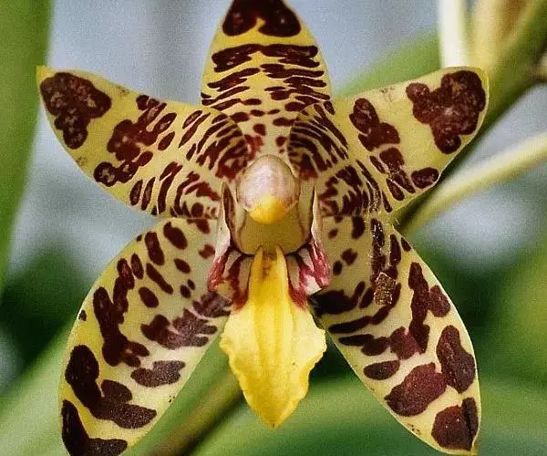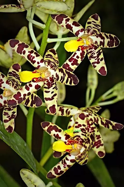 花序1-6个,长达35厘米;花序柄粗壮,长5-17厘米,粗4-6毫米,被3-4枚鞘;花序轴长约为花序长的1/3-1/2,疏生5-8朵花;花苞片大,宽卵形,长1.2-1.5厘米,宽7-10毫米,先端钝;花梗和子房长3-4厘米;花大,稍肉质,萼片和花瓣黄色带暗紫色斑点;萼片近相似,近宽倒卵形,长2-2.6厘米,宽1.2-1.5厘米,先端钝,具10条脉,在背面中肋隆起呈龙骨状。