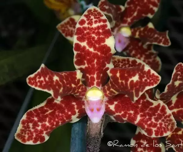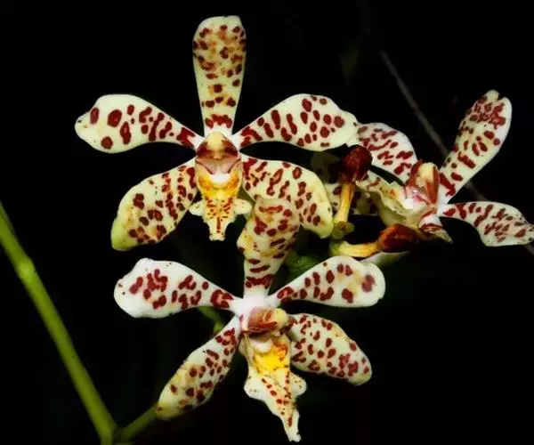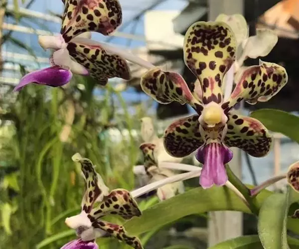 湿唇兰(学名:Hygrochilus parishii (Rchb. f.) Pfitz.):茎粗壮,长被宿存的叶鞘所包,上部具3-5枚叶。叶长圆形或倒卵状长圆形。花序1-6个,长达35厘米;疏生5-8朵花;花大,稍肉质,萼片和花瓣黄色带暗紫色斑点;萼片近相似,近宽倒卵形;花瓣宽卵形,长1.5-2.2厘米,宽1.4-1.7厘米,先端钝,具10条脉;唇瓣肉质,贴生于蕊柱基部,长约为萼片的一半,3裂。花期6-7月。