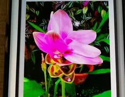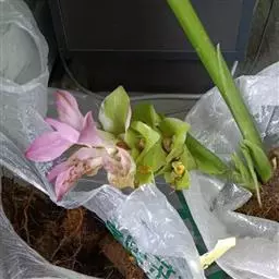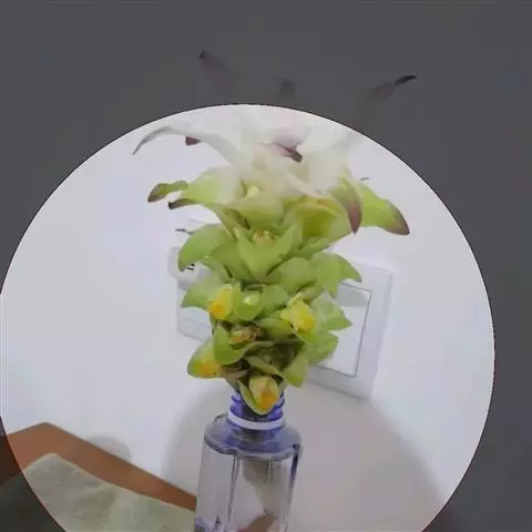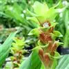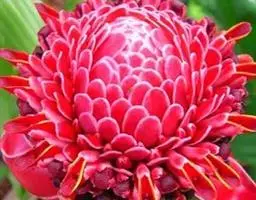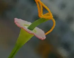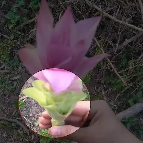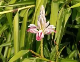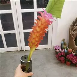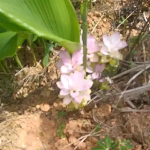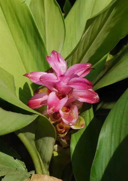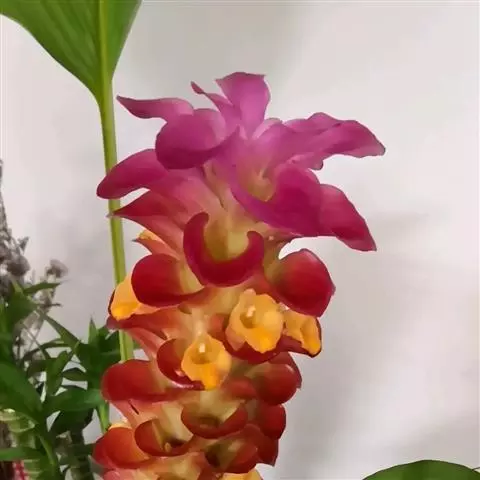 穗状花序从根茎抽出,和具叶的营养茎分开;总花梗长7-14厘米,花序长约15厘米,直径约7厚米;花序下部的苞片阔卵形,长约4厘米,先端平展,淡绿色,上部的苞片长圆形,斜举,淡红色;花生于下部和中部的苞片腋内;花萼白色,长约1厘米,一侧裂至中部,先端有3钝齿;花冠管长2厘米,喇叭状,喉部密生柔毛,花冠裂片3片,卵形,长约1厘米,后方的1枚较宽,宽约9毫米,先端尖,略成兜状,两侧的稍狭;侧生退化雄蕊长圆形,与花冠裂片近等长;唇瓣近圆形,淡黄色,先端3浅圆裂,中部裂片稍长,先端2浅裂;花丝扁阔,花药狭长圆形,长约4毫米,药室紧贴,基部有距;花柱丝状,无毛,柱头头状,具缘毛;子房被长柔毛。花期5-7月。