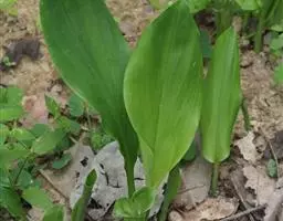根茎卵球形,长4-5厘米,直径约2.5-3.5厘米,有或多或少呈横纹状的节,节上有残存的褐色、膜质叶鞘,鲜时内部白色或微带淡奶黄色。须根细长,生根茎周围,末端常膨大成近纺锤形块根;块根直径1.4-1.8厘米,内部乳白色。春季抽叶,叶基生,2-5片,直立;叶片椭圆状披针形,长14-39厘米,宽4.5-7(9.5)厘米,先端短渐尖至渐尖,尖头边缘向腹面微卷,基部渐狭,下延,两面被柔毛;叶舌高约1.5毫米,边缘有长柔毛;叶柄长2-11厘米,被短柔毛;叶鞘长约11-33厘米,被短柔毛。