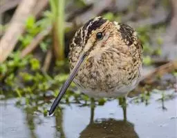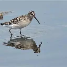 阔嘴鹬是涉禽,体长17厘米。特征为翼角常具明显的黑色块斑并具双眉纹。与黑腹滨鹬平滑下弯的嘴相比,…