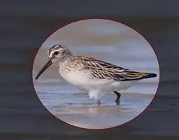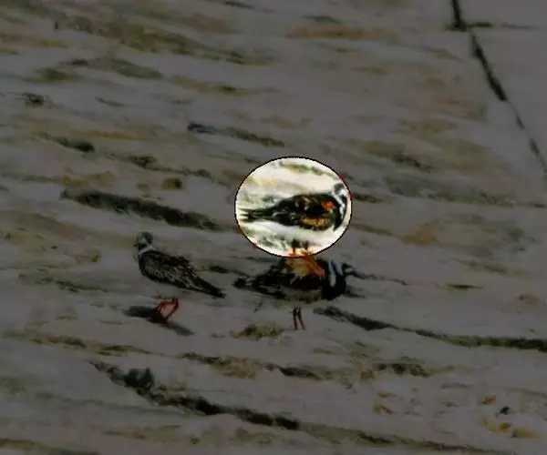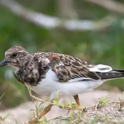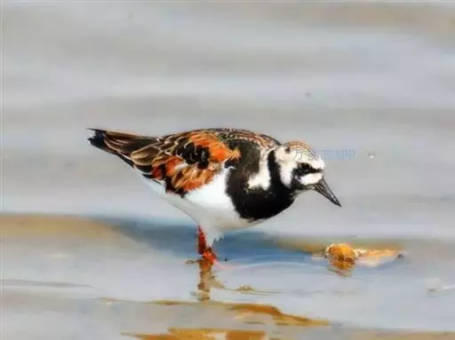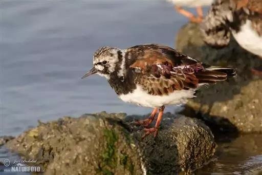 翻石鹬全貌特征 雄鸟夏季头颈白色,头顶与枕具细的黑色纵纹;前额白色,有一黑色横带横跨于两眼之间,并经两眼垂直向下,与黑色颚纹相交。眼先、耳覆羽和喉白色,胸和前颈黑色,两端分别向颈侧延伸,形成两条带斑;前端与黑色颚纹相联,使喉仅中部为白色。其余下体纯白色。背、肩橙红色,具黑、白色斑;下背和尾上覆羽白色,腰具一黑色横带;尾黑色,外侧5对尾羽具窄的白色尖端;初级飞羽黑褐色,羽轴白色,内侧初级飞羽基部白色;大覆羽黑色,具白色端斑,外侧次级飞羽基部也为白色,端部黑色;内侧次级飞羽白色,具黑色端斑;在翅上形成明显的白带。三级飞羽橙栗色,具黑色斑纹;小翼羽及初级覆羽黑色;中覆羽赤褐色;内侧翅覆羽和三级飞羽基部白色,在翅基部形成三角形白斑;雌鸟和雄鸟基本相似,但上体较暗,多为暗赤褐色,头部黑色纵纹较多。冬羽和夏羽相似,但上体橙栗色大多消失,变为暗褐色。背部和胸部黑色变为黑褐色。黑白斑驳也不甚明显。幼鸟似成鸟冬羽,但上体体色更暗,多为褐色,具皮黄白色羽缘。