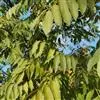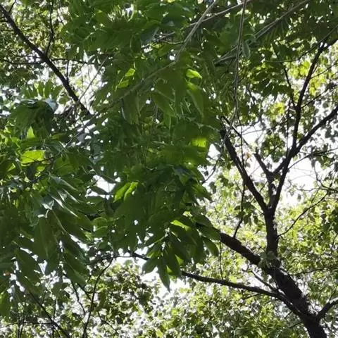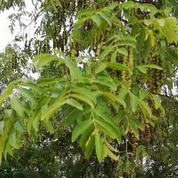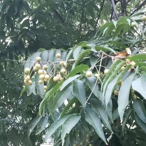 无患子 落叶大乔木,高可达20余米,树皮灰褐色或黑褐色;嫩枝绿色,无毛。单回羽状复叶,叶连柄长25-45厘米或更长,叶轴稍扁,上面两侧有直槽,无毛或被微柔毛;小叶5-8对,通常近对生,叶片薄纸质,长椭圆状披针形或稍呈镰形,长7-15厘米或更长,宽2-5厘米,顶端短尖或短渐尖,基部楔形,稍不对称,腹面有光泽,两面无毛或背面被微柔毛;侧脉纤细而密,约15-17对,近平行;小叶柄长约5毫米。