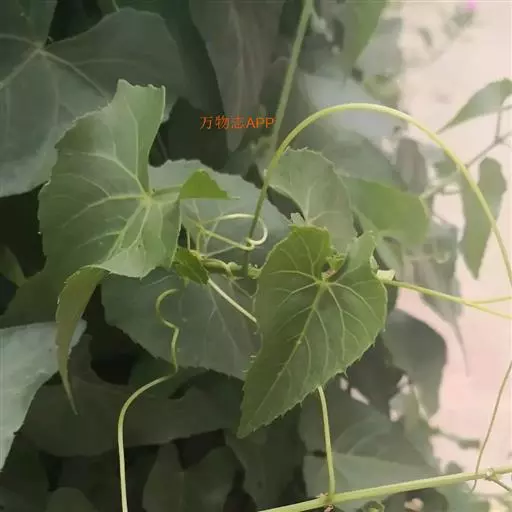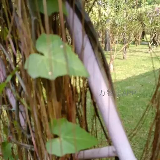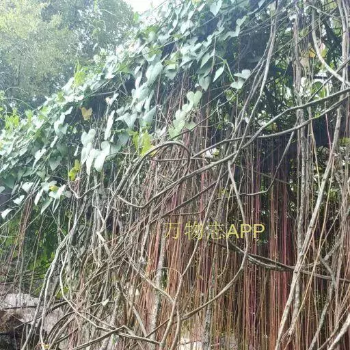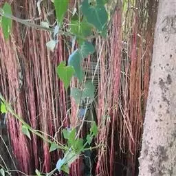 锦屏藤 多年生常绿草质藤蔓植物,具卷须,与叶对生;攀援茎,茎蔓草质柔韧,呈扁形或圆柱形,老茎蔓呈灰白色,表皮粗糙,嫩茎青绿色,表皮光滑油亮,主蔓粗度达2~3厘米,蔓长10~15米;气生根线形,着生于茎节处,每节可长出5~7条气生根,短截的气生根可分生多条侧根,下垂生长。初生气根紫红色,质地光滑脆嫩,老熟气根黄绿色,质地粗糙柔韧,长度可达3~4米或更长。
