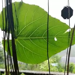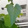 单叶互生,叶色深绿,阔卵形,叶长8~13厘米、叶宽7~11厘米。叶尖渐尖,叶基心形,叶缘微具钝齿,齿凹处有不明显软刺。叶柄绿色,长约2~4厘米,叶脉为羽状脉,叶面平展。