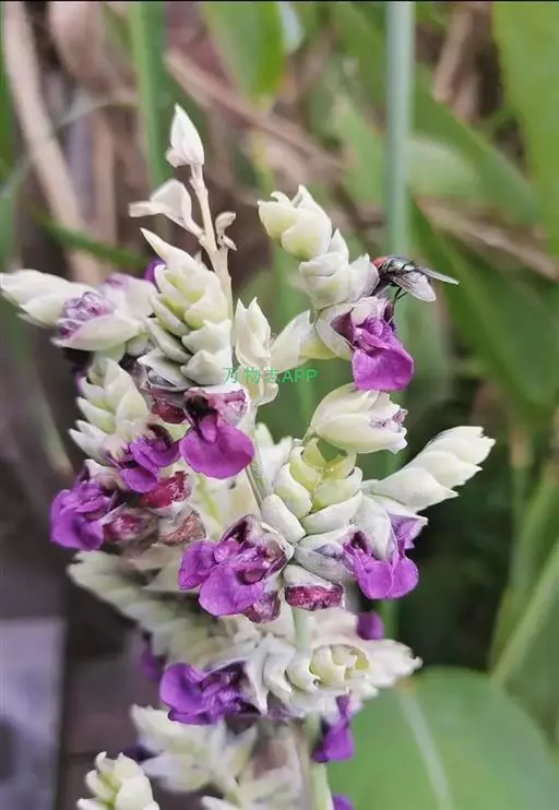 复穗状花序,生于由叶鞘内抽出的总花梗顶端;总苞片多数,半闭合,花时易脱落;小花紫红色,2-3朵小花由两个小苞片包被,紧密着生于花轴;多仅有一朵小花可以发育成果实,稀两个或三个均发育成果实。小苞片0.8-1.5 厘米,凹形,革质,背面无毛,表面具蜡质层,腹面具白色柔毛。萼片 1.5-2.5 毫米,紫色;侧生退化雄蕊呈花瓣状,基部白色至淡紫色,先端及边缘暗紫色,长1.2-1.5厘米,宽约0.6厘米;花冠筒短柱状,淡紫色,唇瓣兜形,上部暗紫色,下部淡紫色。蒴果近圆球形或倒卵状球形,长、宽轴约为0.9-1.2至0.8-1.1厘米,果皮浅绿色,成熟时顶端开裂。成熟种子棕褐色,表面粗糙,具假种皮,种脐较明显。2n = 12。