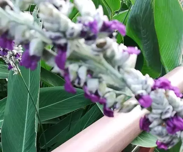再力花为多年生挺水植物,草本。植株高100-250 厘米(植株中等大小,植株叶面高度60-150 厘米,但总花梗细长,常高出叶面50-100 厘米);叶基生,4-6片;叶柄较长,约40-80 厘米,下部鞘状,基部略膨大,叶柄顶端和基部红褐色或淡黄褐色;叶片卵状披针形至长椭圆形,长20-50 厘米,宽10-20厘米,硬纸质,浅灰绿色,边缘紫色,全缘;叶背表面被白粉,叶腹面具稀疏柔毛。叶基圆钝,叶尖锐尖;横出平行叶脉。