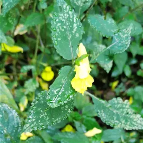 为害症状:主要为害叶、茎和花。叶片染病 菌丝体生在叶两面,形成白色放射状圆形毡状斑片,后来相互融合形成大片,病斑上布满白粉。秋末,病部产生黑褐色小粒点,即病原菌子囊壳。茎、花染病产生与叶片类似的症状。近年该病发生普遍,5-9月均可发生,受害严重的造成植株衰弱,叶片变黄提早枯死。