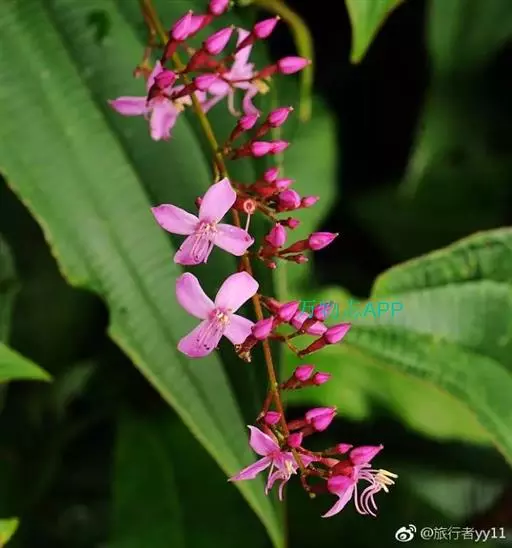 总花梗多数生于上部叶腋。近伞房状排列,短于叶,长8-9厘米,具3-5花;花梗细,长10-15毫米,基部有苞片;苞片卵形,长4-5毫米,渐尖,脱落。花红色,长2.5-3厘米;侧生萼片2,斜卵圆形,长5毫米,宽3毫米,顶端渐尖,具多脉。旗瓣圆形,直径10-11毫米,背面中肋增厚,具龙骨状突起,具突尖;翼瓣短,无柄,长15毫米,基部裂片圆形,上部裂约长于基裂片的2倍,半月形,顶端短收缩;背部具小耳;唇瓣檐部漏斗形,长14-15毫米,口部斜上,宽13-15毫米,先端尖,基部狭成与檐部近等长内弯的距。花丝线形,长3毫米,花药小,顶端钝。子房纺锤形,直立,喙尖。