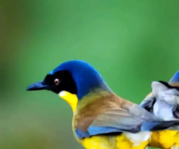 黄喉噪鹛是一种体型略小的噪鹛,身长23厘米,体重55-57克。顶冠蓝灰色,特征为具有一个黑色的大面罩,与鲜黄色的喉及下体的美丽黄色形成 鲜明的对比。白色眉,头(眼先、脸颊和耳羽)的其余部分为黑色,翕的所有上部为棕赭色。上体褐色,尾端黑色而具白色边缘,下体淡黄色,侧面具橄榄色调,腹部及尾下覆羽皮黄色而渐变成白色。在飞行中,白色外侧尾羽和尾下形成非常华丽的外观。因鲜艳而显眼的黄色喉部而得名。羽毛非常细腻,虹膜红褐色,具蓝色眼环;鸟喙黑色;腿和脚黑灰色。