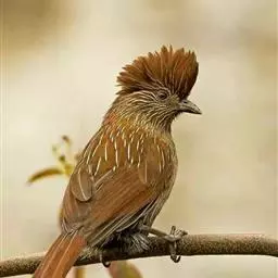 条纹噪鹛是画眉科、噪鹛属中型鸟类,体长28-32厘米。头具短的羽冠,上体栗褐色,飞羽外翻蓝灰色。…