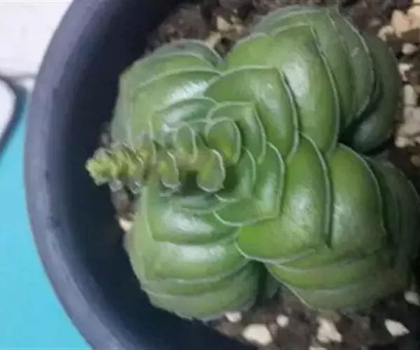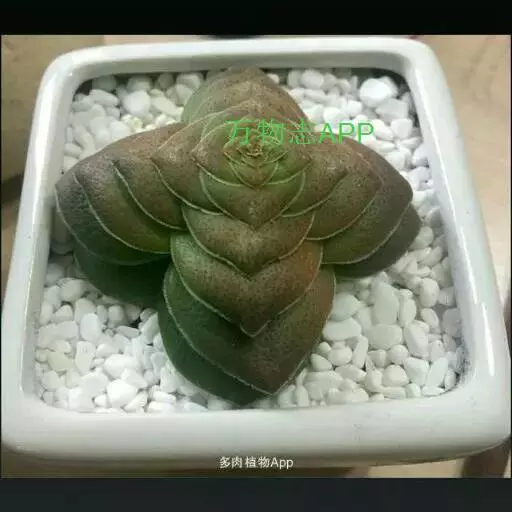 巴的植株具短茎,肉质叶半圆形,交互对生,上下叠接呈十字形排列,叶面绿色,有光泽,叶面密生细小疣突而略显粗糙,顶端有椭圆形尖头,整个叶缘有白色毫毛,看起来就象镶上的白边,植株基部易生侧芽。