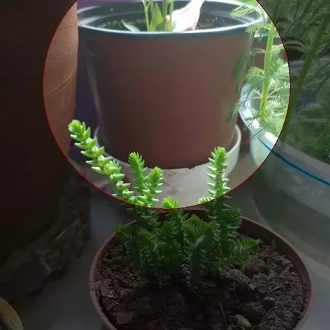 巴,学名:Crassula hemisphaerica,多年生肉质草本植物、也称多浆植物,植株具短茎,肉质叶半圆形,交互对生,上下叠接呈十字形排列,叶面绿色,有光泽,因密生白色细小疣突而略显粗糙,顶端有椭圆形尖头,全缘具白色毫毛,基部易生侧芽。聚伞花序,小花白色。