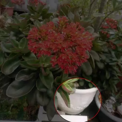 叶子表面宽厚,富肉质感且带有磨纱质感,看像石头质地;开红色小花,生于植株顶部,倒伞形密生,形状像花…