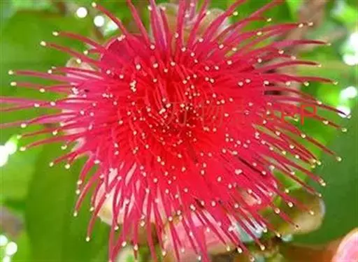 头状花序腋生,直径约3厘米(连花丝),有花约25-40朵,总花梗长1-3.5厘米;花萼钟状,长约2毫米,绿色;花冠管长3.5-5毫米,淡紫红色,顶端具5裂片,裂片反折,长约3毫米,无毛;雄蕊突露于花冠之外,非常显著,雄蕊管长约6毫米,白色,管口内有钻状附属体,上部离生的花丝长约2厘米,深红色。
