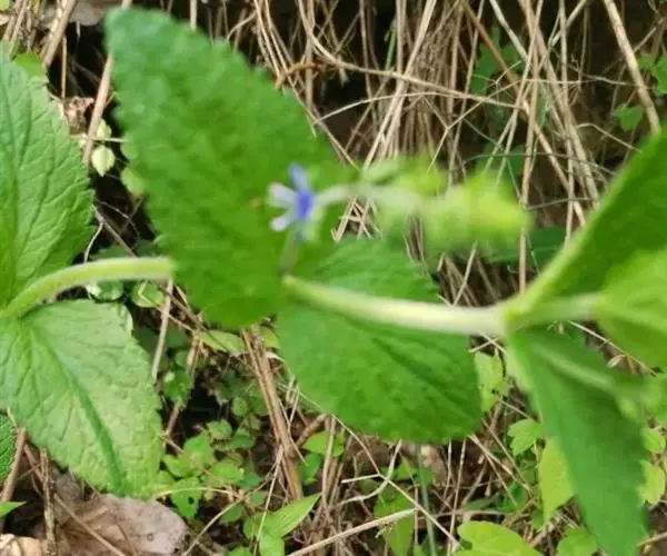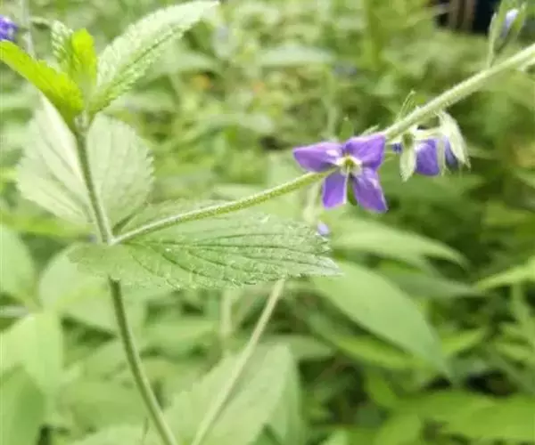 植株高(15)50-80厘米,全体被白色多细胞柔毛。茎直立或上升,不分枝。叶无柄或具极短的叶柄,叶片卵形或卵状三角形,长2-5厘米,宽1-3厘米,边缘具深刻的粗锯齿,多为重锯齿。总状花序单支或成对,侧生于茎中上部叶腋,长而花疏离,果期长达20厘米;苞片宽条形或倒披针形,长约5毫米;花梗比苞片短得多;花萼裂片条状长椭圆形,花期长4毫米,果期长5-6毫米;花冠辐状,紫色或蓝色,直径6-10毫米,裂片圆形至菱状卵形;雄蕊与花冠近等长。蒴果倒心形,长4-5毫米,宽5-6毫米,基部楔状浑圆,有多细胞睫毛,花柱长3-4毫米。种子南瓜子形,长略过1毫米。花期6月。2n=46