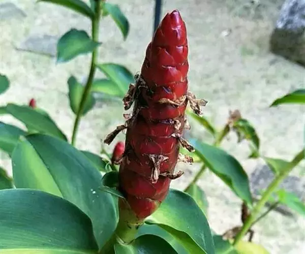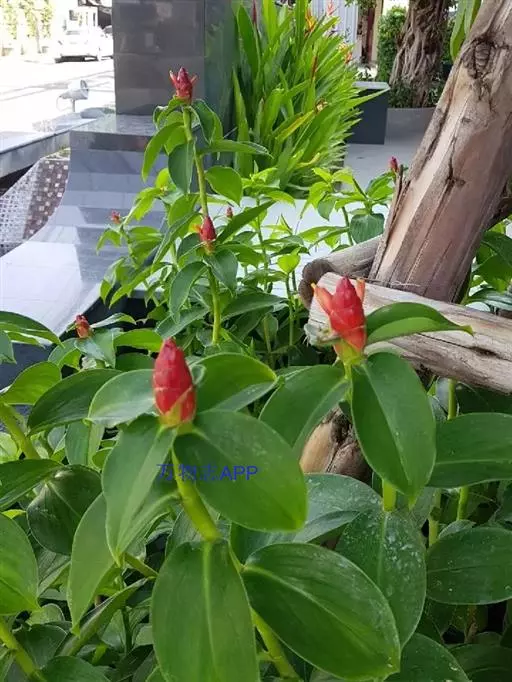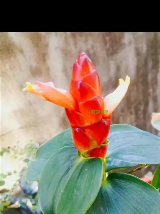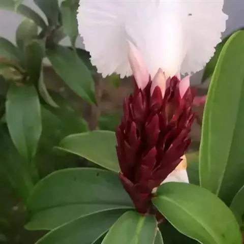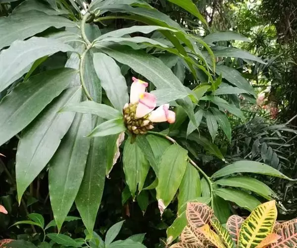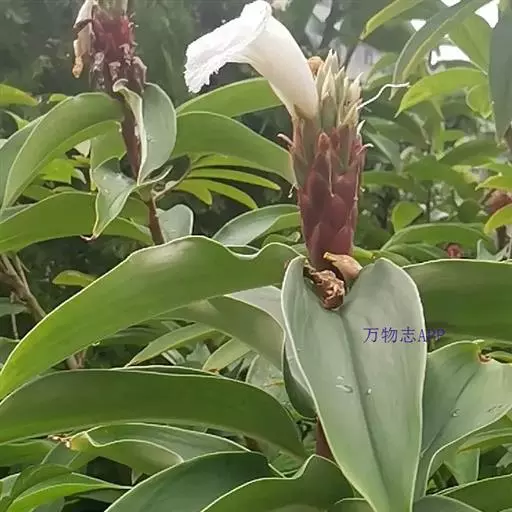 株高1-3米,基部近木质,顶部常分枝,旋卷。叶片长圆形或披针形,长15-20厘米,宽6-10厘米,顶端渐尖或尾状渐尖,基部近圆形,叶背密被绢毛。穗状花序顶生,椭圆形或卵形,长5-15厘米;苞片卵形,革质,红色,长2厘米,被短柔毛,具增厚及稍锐利的短尖头;小苞片长1.2-1.5厘米,淡红色;花萼革质,红色,长1.8-2厘米,3裂,嫩时被绒毛;花冠管短,长1厘米,裂片长圆状椭圆形,长约5厘米,白色或顶部红色;唇瓣宽喇叭形,纯白色,长6.5-9厘米,顶端具裂齿及皱波状;雄蕊花瓣状,长约4.5厘米,宽1.3厘米,上面被短柔毛,白色,基部橙黄。蒴果稍木质,长1.3厘米,红色;种子黑色,光亮,长3毫米。花期:7-9月;果期:9-11月。