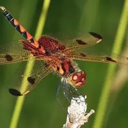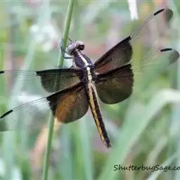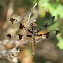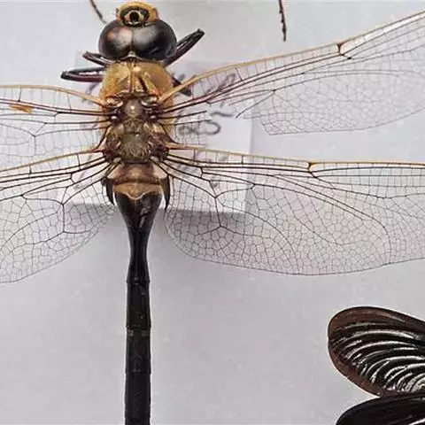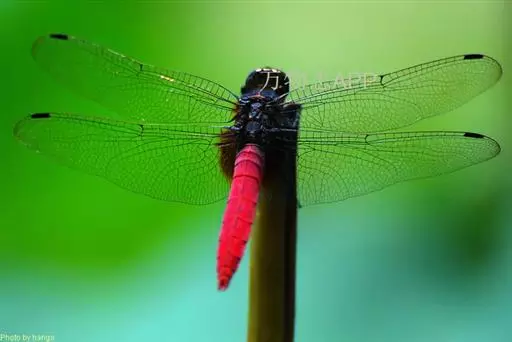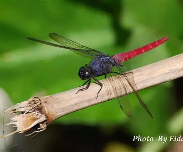 形态特征:中型种类,腹长约30mm,较粗壮;红褐色,翅基部具有小型褐色斑;胸部色暗;额色黑;为其较为突出的特征。常见于林地、池沼等环境中。