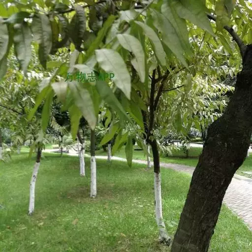 叶片长圆披针形、椭圆披针形或倒卵状披针形,长7-15厘米,宽2-3.5厘米,先端渐尖,基部宽楔形,上面无毛,下面在脉腋间具少数短柔毛或无毛,叶边具细锯齿或粗锯齿,齿端具腺体或无腺体;叶柄粗壮,长1-2厘米,常具1至数枚腺体,有时无腺体。