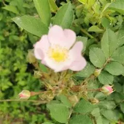 峨眉蔷薇,是蔷薇科蔷薇属直立灌木植物。峨眉蔷薇的小枝无刺或有扁而基部膨大皮刺;小叶长圆形或椭圆状长圆形,无毛;叶轴和叶柄有散生小皮刺,离生部分三角状卵形,边缘有齿或全缘;花单生叶腋,萼片披针形,全缘;花瓣白色,倒三角状卵形;蔷薇果倒卵圆形或梨形,熟时亮红色,果柄肥大,宿萼直立;花期为5-6月,果期为7-9月。峨眉蔷薇以产地命名。峨眉蔷薇产于中国多地,生于山坡、山脚下或灌丛中。峨眉蔷薇耐干旱,耐瘠薄,对土壤要求不严,在土层深厚、疏松、肥沃湿润且排水通畅的土壤中生长更好。峨眉蔷薇的繁殖方式为播种、扦插、压条。峨眉蔷薇的果实成熟时味甜,可鲜食,也可酿酒,晒干磨粉掺入面粉可作食品,其果实中含有糖及维生素等。峨眉蔷薇的果实不仅可以食用,还可入药,有止血、止痢、涩精之效。除此之外,峨眉蓄薇根皮含鞣质,可提制烤胶。