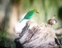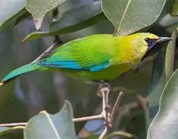 蓝翅叶鹎:小型鸟类,体长15-18厘米。雄鸟通体草绿色,尾蓝绿色,肩和翅亮蓝 色,胸缀有黄色,…