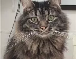 休息中的大灵猫 大灵猫体形细长,比家猫大得多,大小与家犬相似,成年体重6~10千克,体长60~80厘米,最长可达100厘米。头略尖,耳小,额部较宽阔,吻部稍突,前足第三、四趾有皮瓣构成的爪。体毛为棕灰色,带有黑褐色斑纹,口唇灰白色,额、眼周围有灰白色小麻斑。背中央至尾基有一条黑色的由粗硬鬃毛组成的纵纹,颈侧和喉部有3条显著的波状黑领纹,其间夹有白色宽纹,腹毛浅灰色。四肢较短,黑褐色,尾长超过体长的一半,尾具5~6条黑白相间的色环,末端黑色。