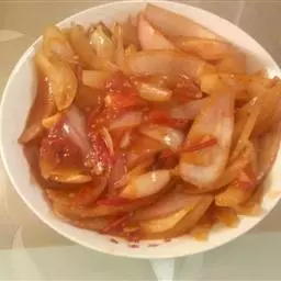 2、 锅内放油烧热,加入洋葱丝,青椒丝,红椒丝,香菇丝,白菜丝,炒均后放入年糕,加入韩国大酱,盐,味精,鸡精加热炒均,装盘即可。最后撒入少许白芝麻点缀。