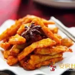 2、 放入1000克油烧至160度,放入年糕炸至金黄色即可