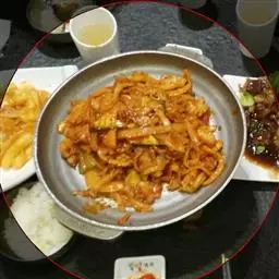 辅料:香菇丝,白菜丝,青椒丝,红椒丝,洋葱丝各100克,韩国大酱100克,番茄沙司50克,盐,味精,鸡精少许