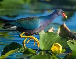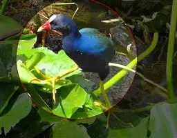紫水鸡脚上虽然没有蹼,但却会游泳、潜水。它们生活在水边水草繁茂的地方,有时也会游到水面较宽阔的地方去寻找食物。其食物以植物为主,也食一些螺类和水栖昆虫。