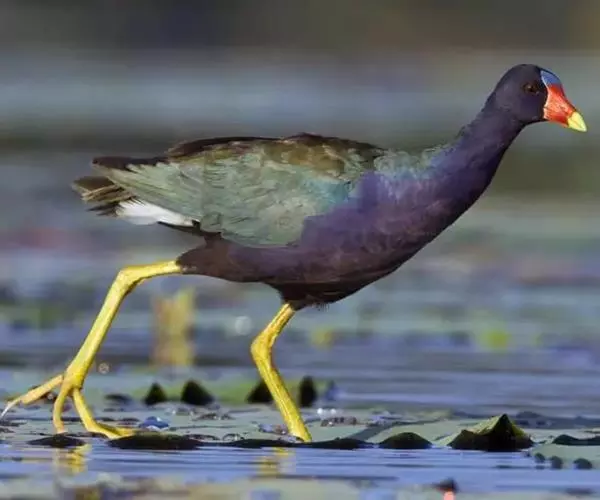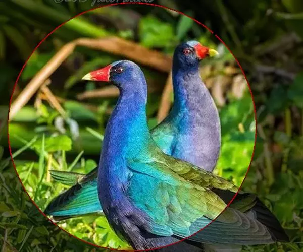 这种紫水鸡非常美丽,体羽有亮丽的光泽。额顶有一块亮青色的额甲,在这之下是鲜艳的红鼻瘤。嘴粗壮,短而侧扁;鼻沟浅而宽,鼻孔小而圆,在鼻沟前部下方,额甲宽大,后缘呈截形。翅圆形,第2枚、第3枚和第4枚初级飞羽最长,并几乎等长;第1枚和第6枚或第7枚初级飞羽等长。跗蹠和趾都长而有力;能用脚趾抓住和操纵食物,两性同型,体羽为紫色或蓝色,尾下覆羽略淡。