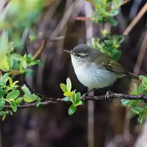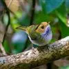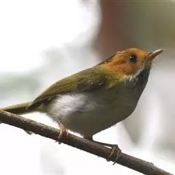 棕脸鹟莺:体长10厘米,是一种色彩亮丽而有特色的莺鸟。头栗色,具黑色侧冠纹。上体绿,腰黄色。下体白,…