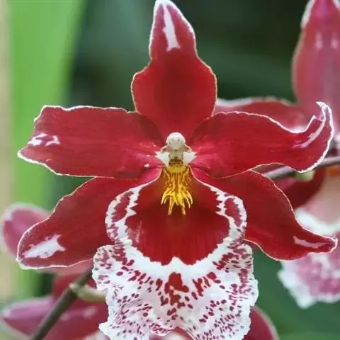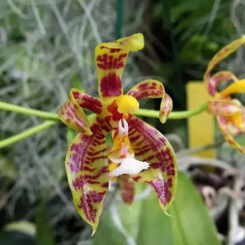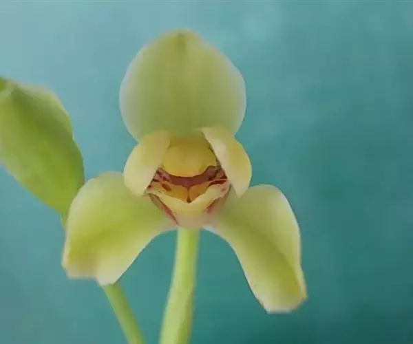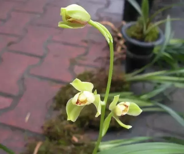 花莛挺立,高15-24cm,黄绿色;一莛着花3-6朵,排列松散;花序基部鞘底色黄绿,微被紫红色筋纹;花苞片长阔,颜色与花莛相近;萼片(外三瓣)长圆形,基部狭,向 夏皇梅 前渐阔,2/3处最阔,前端收狭且紧边,尖端成对折状,中线部分外凸,萼片长1.6-2.0cm,宽0.7-0.9cm,色黄绿,偏黄;花瓣(捧心、捧瓣)较萼片短小,与唇瓣(舌)同时分立于蕊柱(鼻头)三侧,并紧靠蕊柱,花瓣基部狭长,从中部起紧边,前端圆钝,起深兜,两花瓣前端分离大,蕊柱顶明显外露,花瓣浅黄色,其中下部、蕊柱腹部具均匀的紫红斑纹;唇瓣短圆,中裂片前端微下挂,明显增厚,边缘微内卷呈浅兜,侧裂片不明显,唇瓣底色浅黄,两侧密被紫红色纹,并且透于外部;花直径1.8-2.2cm。
