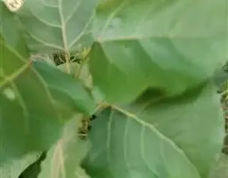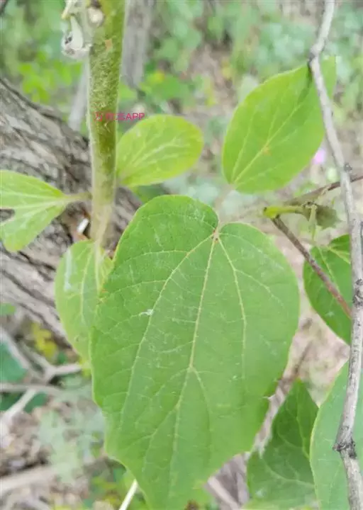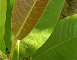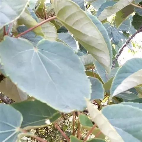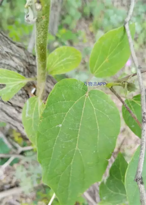 叶厚纸质,卵形至卵状披针形,长8-18厘米,宽4-10厘米,先端渐尖或急尖,尖头有的长尾状,基部圆形或心形,有2-4个圆形和紫色腺体,边缘有浅钝齿,上面深绿色,有光泽,脉上有毛,下面淡绿色,有短柔毛,掌状脉,中脉在上面凹,在下面突起,近对生的侧脉5-8对;叶柄长2-6厘米,初时有疏长毛,果熟后近无毛。