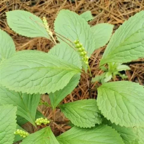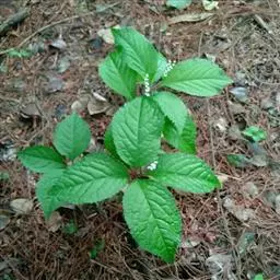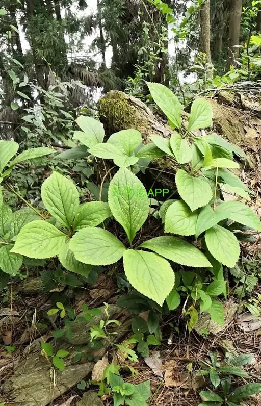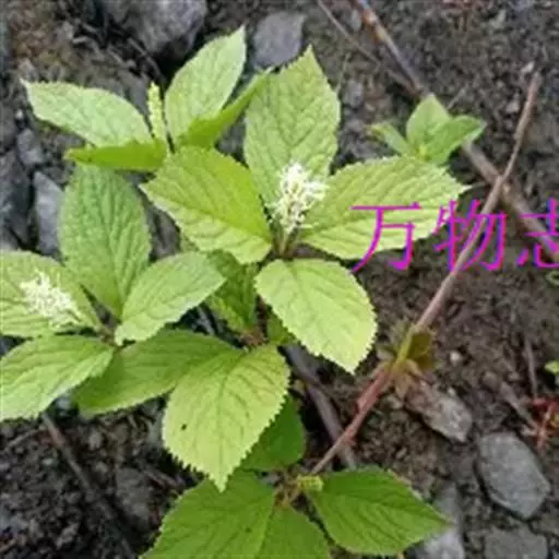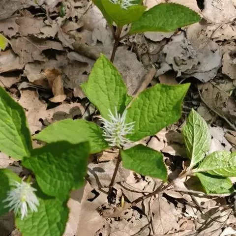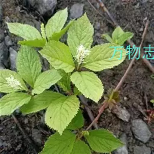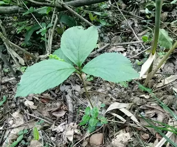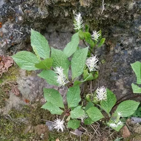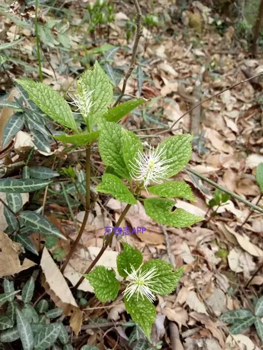 多年生草本,高15-40厘米,全部无毛;根状茎粗短,密生多数细长须根;茎直立,单生或数个丛生,下部节上对生2片鳞状叶。叶对生,通常4片生于茎上部,纸质,宽椭圆形、长椭圆形或倒卵形,长5-11厘米,宽3-7厘米,顶端短尖,基部宽楔形,边缘有圆锯齿或粗锯齿,齿尖有一腺体,近基部全缘,嫩叶背面密生细小腺点,但老叶不明显;侧脉4-6对,网脉明显;叶柄长1-1.5厘米;鳞状叶三角形;托叶条裂成钻形。穗状花序单一,由茎顶抽出,连总花梗长4-6厘米;苞片倒卵形,通常2-3齿裂;花白色,有香气;雄蕊3枚,药隔基部合生,着生于子房上部外侧,中央药隔具1个2室的花药,两侧药隔各具1个1室的花药,药隔伸长成丝状,直立或斜上,长1-1.9厘米,药室在药隔的基部;子房倒卵形,无花柱。核果球形,淡黄绿色,有纵条纹,长约3毫米,近无柄。花期4-5月,果期5-6月。