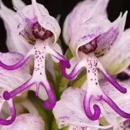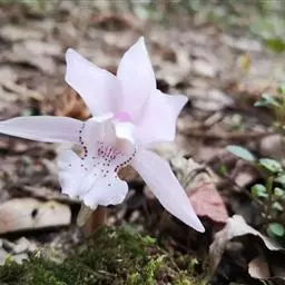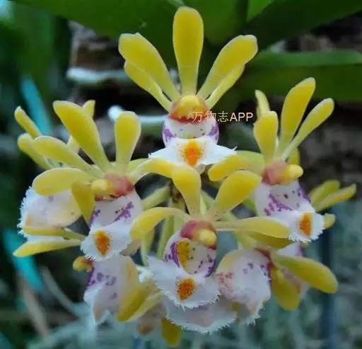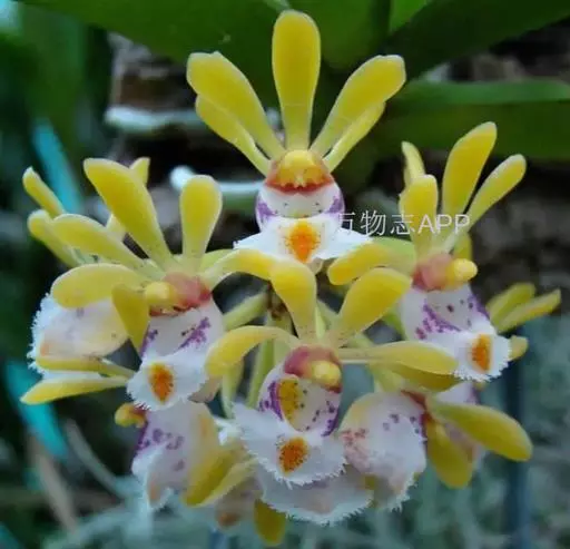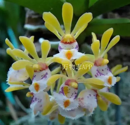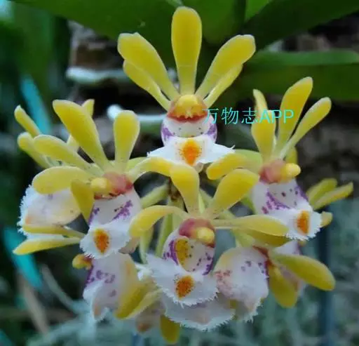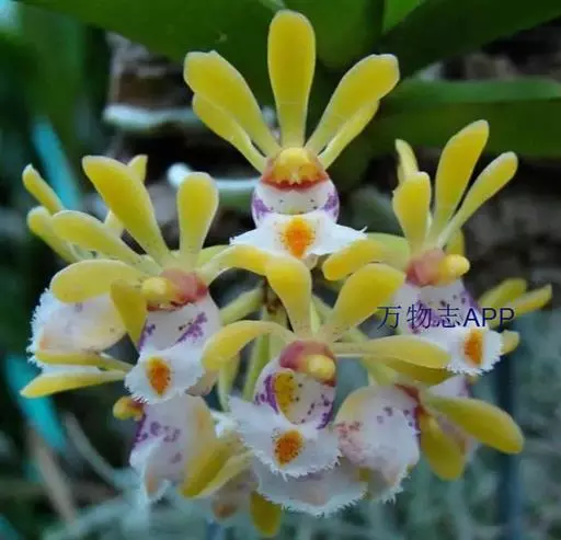 无茎盆距兰(学名:Gastrochilus obliquus (Lindl. ) Kuntze):茎粗短,长1-2厘米,具3-5枚叶。叶二列,稍肉质或革质,长圆形至长圆状披针形,先端钝并且不等侧2裂。花序近伞形,1-4个,出自茎的基部侧旁,常具5-8朵花;花芳香,萼片和花瓣黄色带紫红色斑点;萼片几等大,近椭圆形,花瓣匙形,比萼片小,先端钝;前唇白色,近三角形,长约5毫米,宽8-10毫米,末端外侧黄色带紫红色斑点,具3条脊。花期通常10月。