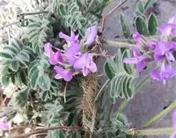 总状花序顶生和腋生,顶生者通常分枝成圆锥花序,长达12厘米;总花梗密被开展或向上硬毛和小绒毛;花通常2朵生于每节上;苞片早落,狭卵形,长3-4毫米,宽约1毫米,被毛;花梗长3-5毫米,结果时稍增长,密被开展柔毛;花萼长约3毫米,萼裂片三角形,与萼筒等长;花冠紫色,长约8毫米,旗瓣椭圆形至宽椭圆形,先端微凹,翼瓣狭椭圆形,具瓣柄和耳,龙骨瓣具长瓣柄,微具耳;雄蕊单体,长7.5-8.5毫米;雌蕊长7-10毫米,子房线形,疏被短柔毛。