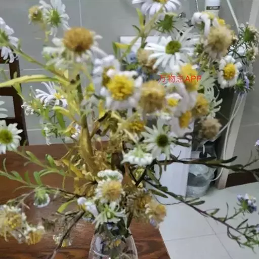 花:头状花序异型,直径1-1.5厘米,在茎枝顶端排成伞房状,花序梗长3-6厘米;总苞片2层,苍绿色,顶端钝,边缘白色宽膜质,全缘;花托长圆锥状,中空。舌状花1列,舌片白色,反折,长约6毫米,宽2.5-3毫米;管状花多数,花冠黄色,长约1.5毫米,中部以上扩大,冠檐5裂。