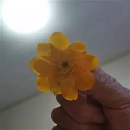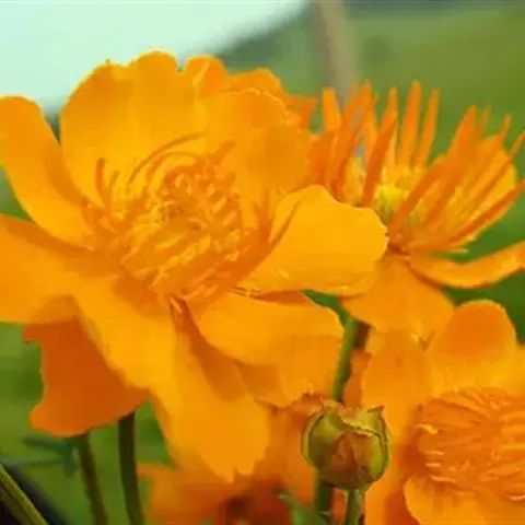 花单生或2-3朵组成疏松的聚伞花序,直径2.7-3.2厘米;苞片似茎上部叶,渐变小,花梗长2-6厘米;萼片5片,黄色,干时不变绿色,倒卵形或圆倒卵形,顶端圆形,生少数小齿,长1.4-1.6厘米,宽1-1.4厘米;花瓣约9个,与雄蕊近等长,线形,顶端钝,长6-7毫米,宽1毫米;雄蕊长5-7.5毫米,花药长2-3毫米;心皮7-15。