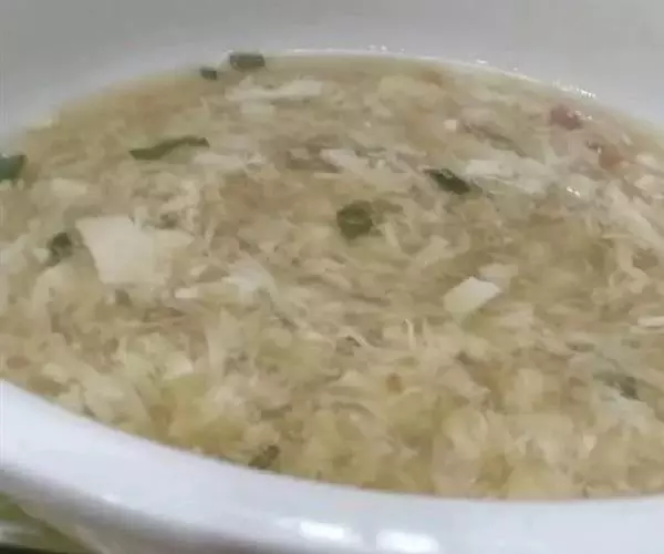 ③将蛋清打散加入芡汁中,边倒边拌成细蛋花。
