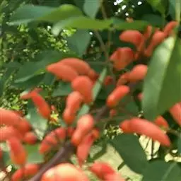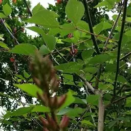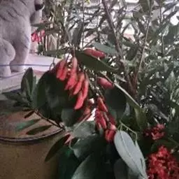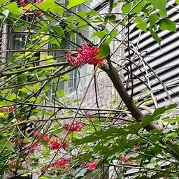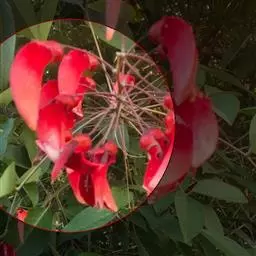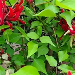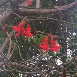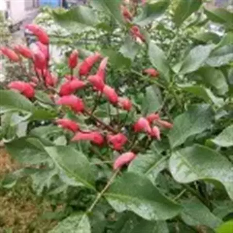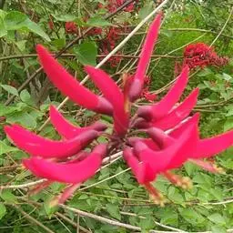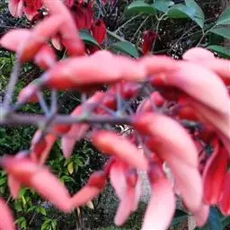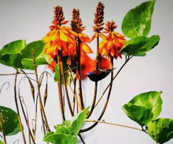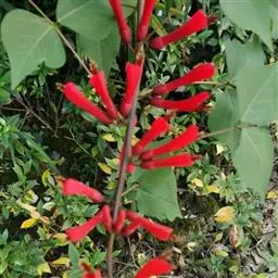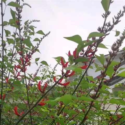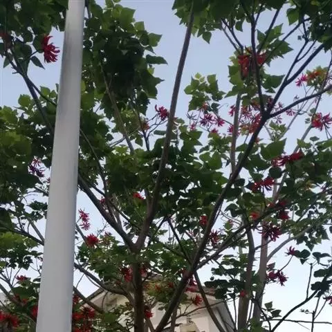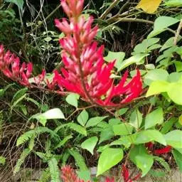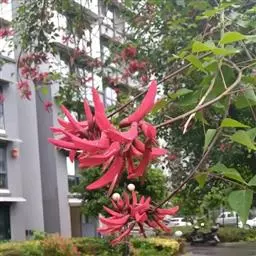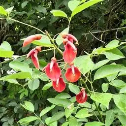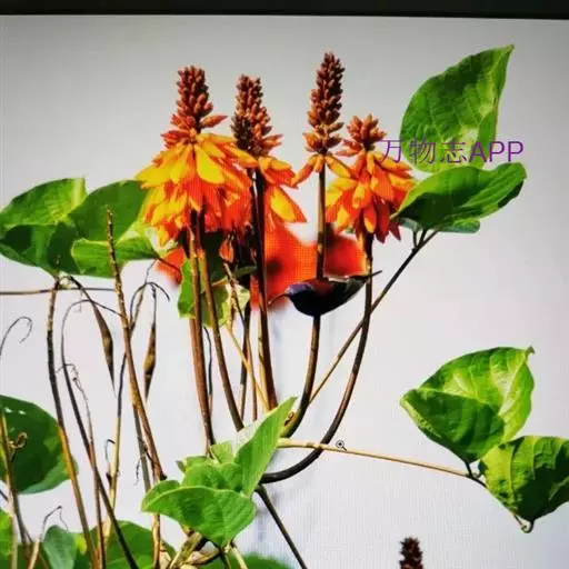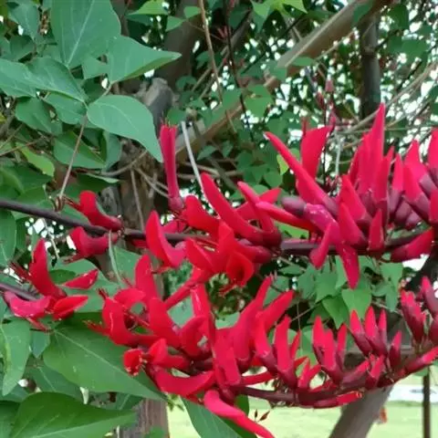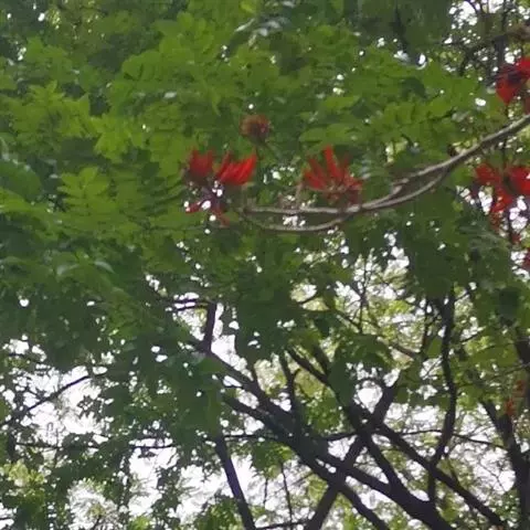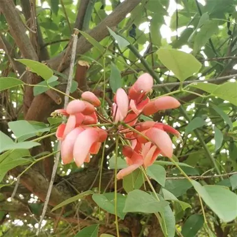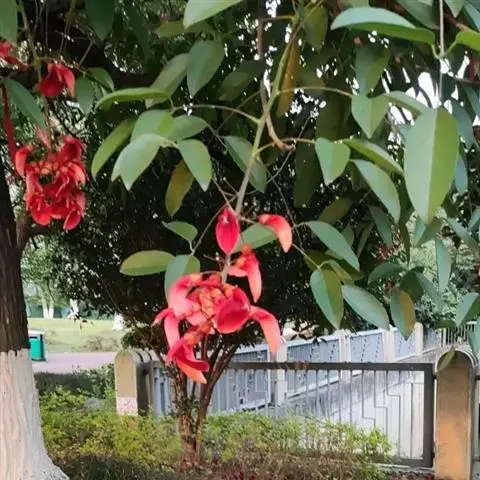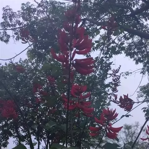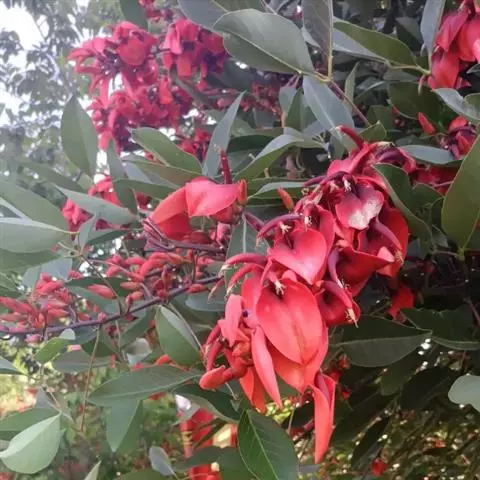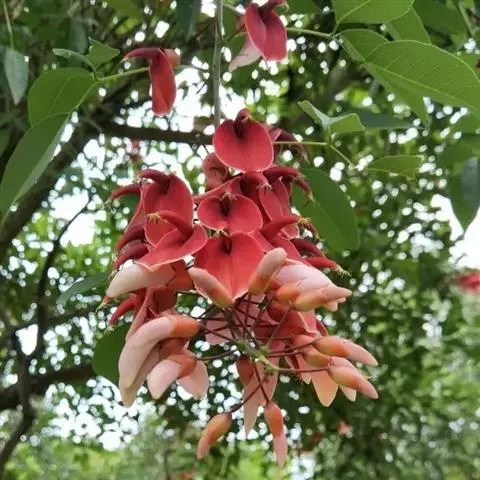 龙牙花(Erythrina corallodendron Linn.)与鹦哥花的主要区别是:顶生小叶菱形,长4-10厘米,旗瓣椭圆形,长4.5-6厘米,种子深红色,有黑斑。花期6-7月。