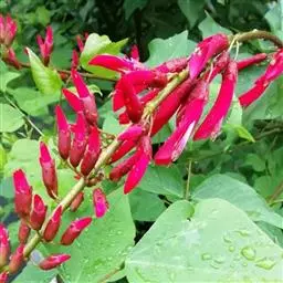 总状花序生于先端叶腋,单生,直立,比叶长;花鲜红色,大,具花梗,下垂;苞片单生,卵形,内有3朵花,在每一花梗基部有一小苞片;花萼陀螺形,肢截平或具不等的2裂;花冠红色,旗瓣近卵形,舟状,长约3.2厘米,翼瓣比龙骨瓣短,斜倒卵形,龙骨瓣长仅及雄蕊的一半;花丝比旗瓣稍短,在近基部联合成一体;子房具长柄,花柱与雄蕊同长。荚果弯曲,长12-19厘米,宽约3厘米或更宽,有明显的喙和果梗,有种子5-10颗;种子带白色或褐色,肾形,长约2厘米。