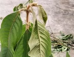 嫩枝呈圆柱形,直径0.4-0.9cm,表面灰褐色,被黄褐色星状毛及多细胞腺毛,质脆,易折断,断面遭受部明显。叶多卷曲皱缩,完整者展平后呈倒卵形或卵状椭圆形,长8-20cm,宽3-9cm;先端较尖,基部略呈心形,边缘有三角状锯齿,上表面暗棕色,下表面有黄色腺点,两面均有柔毛;叶柄极短,长仅约0.3cm。气微、味微苦、涩。