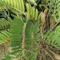 篦齿苏铁:树干圆柱形,高达3米。羽状叶长1.2-1.5米,叶轴横切面圆形或三角状圆形,柄两侧有疏刺,…