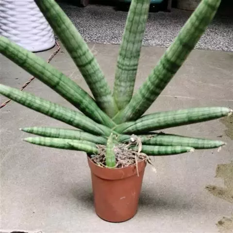 圆叶虎尾兰又名棒叶虎尾兰、筒叶虎尾兰、筒千岁兰等,茎短或无,肉质叶呈细圆棒状,顶端尖细,质硬,直立生长,有时稍弯曲,叶长80~100厘米,直径3厘米,表面暗绿色,有横向的灰绿色虎纹斑。总状花序,小花白色或淡粉色。