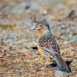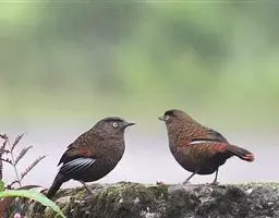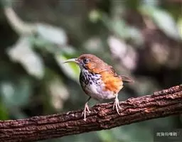 大噪鹛:中型鸟类,体长32-36厘米。额至头顶黑褐色,背栗褐色满杂以白色斑点,…