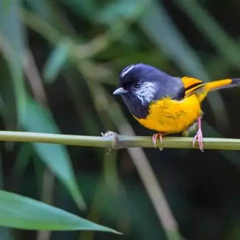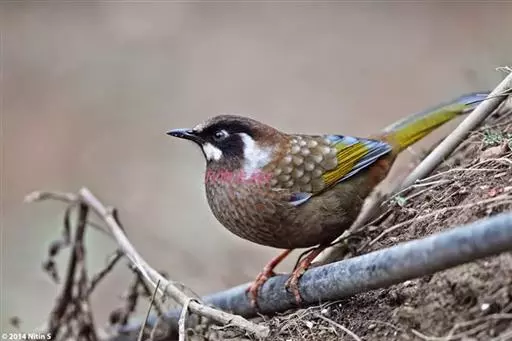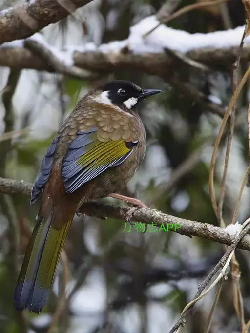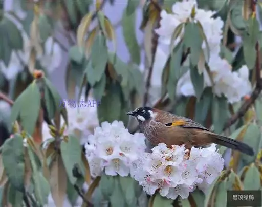 黑顶噪鹛(学名:Garrulax affinis):中型鸟类,体长24-26厘米。前额、脸、颏、喉黑色,头顶黑褐沾棕或深棕橄榄褐色,背栗褐或棕褐色,颧斑白色或棕红色,眼后缘和颈侧亦具白斑,飞羽金黄橄榄色而具蓝灰色尖端。下体淡棕褐色。