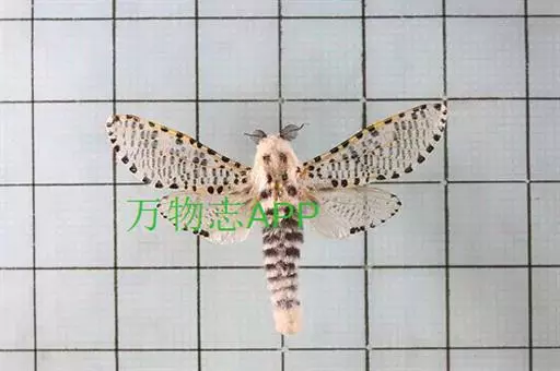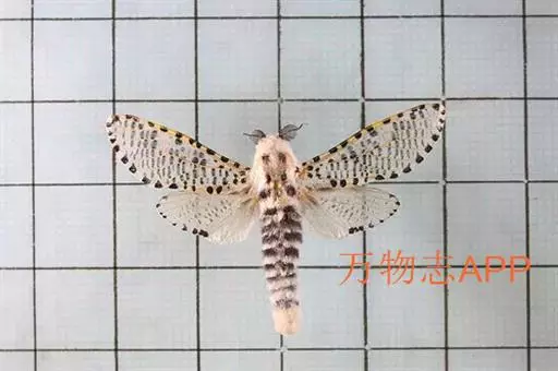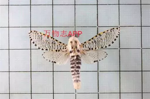 翅展44~68mm;触角黑色;胸部白色,背面有3对黑斑点。雄性前翅脉间密布规则排列的黑色细短纹。腹部白色,每节有黑色横带。